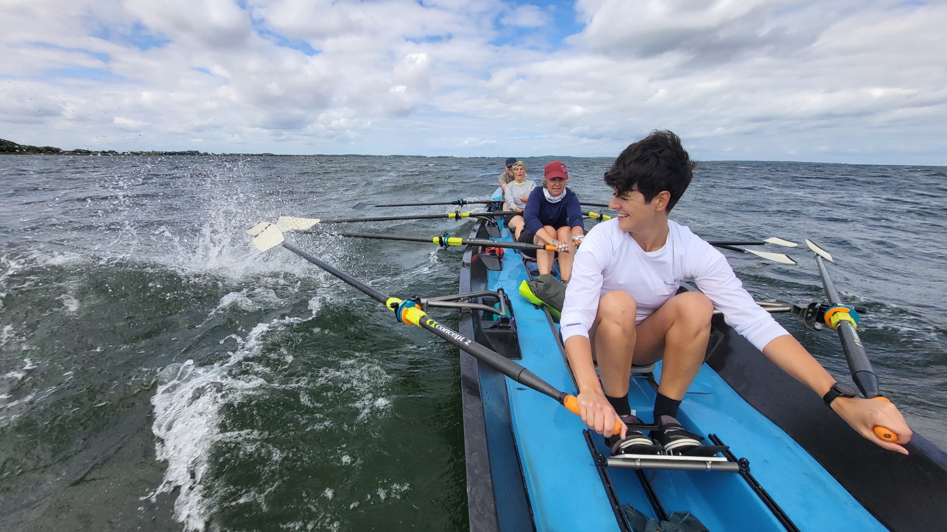 Am nächsten Tag ist der Wind noch stark für eine Hiddensee-Umrundung. Aber eine erste Test-Ausfahrt wagen wir. Rein in die Wellen, raus aus dem Strelasund und Kurs Richtung Norden, gegen die Wellen, zur Ostsee. Erst mal kämpft jeder für sich: mit dem ungewohnten Boot, dem Gewackel, man muss die Skulls auch gut festhalten, damit sie einem nicht aus den Händen gerissen werden von den Wellen. Doch es macht schnell Spaß, der gemeinsame Rhythmus findet sich. Die Weite ist schön.