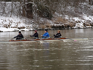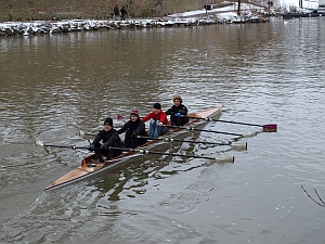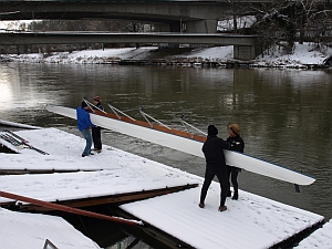 Trotzdem findet der Fortgeschrittene in Gudrun weiterhin eine Ansprechpartnerin vor Ort und kann so den Kontakt zum Ruderclub pflegen. Fast jeden Tag in der Woche bietet Gudrun ihr Rudertraining an. Die ehemalige Postbeamtin sieht in ihrem Engagement beim Ulmer Ruderclub Donau auch einen gesellschaftlichen Sinn. „Der Sport bringt die Jugendlichen von der Straße“, erklärt sie. Doch wo bleiben die anderen Ruderer? Gudrun bleibt gelassen, auch in der eisigen Kälte, und plötzlich betreten zwei junge Männer die Bootshalle. Es ist drei Uhr, der Doppel-Vierer ist voll. Es folgt ein kurzes „Hallo“, und dann geht alles ganz schnell. Gudrun meldet ihre Bootsnutzung beim Computer an, die Skulls werden ausgesucht und dann tragen alle vier das Boot gemeinsam zur Donau hinunter.