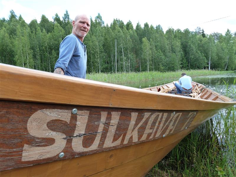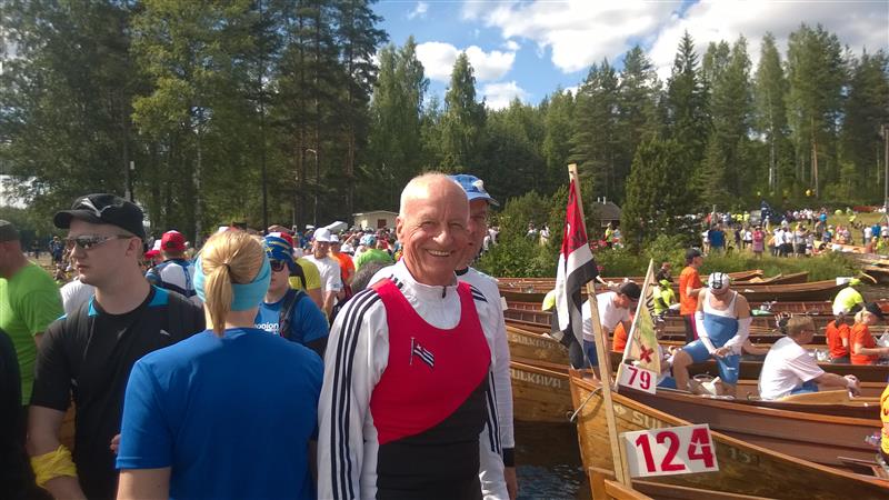 Ein ehemaliger Pistenbully-Kollege von "Bello" Strähle, Juha Ruottinen, kam als Wegbereiter vor Ort und als Mitruderer ins Spiel, denn als Neulinge auf recht fremdem Territorium hätten wir uns schwer getan. Er hat wie so viele Finnen ein Sommerhaus unweit von Wald und See – und wo? Ganz in der Nähe von Sulkava. Er besorgt unser vergleichsweise neues Leihkirchboot vom Veranstalter, das während der Regattatage gleich mehrmals vermietet wird. Außerdem hat ihn das 60-km-Rennen nicht wirklich abgeschreckt, denn zusammen mit uns rudert Juha Ruottinen (59) es 2015 bereits zum 16 Mal. Er wusste, wann man wo sein sollte und wie man sich am Start nach vorne mogelt, auch wenn offiziell eine Zeitstrafe von 10 Minuten angedroht war.