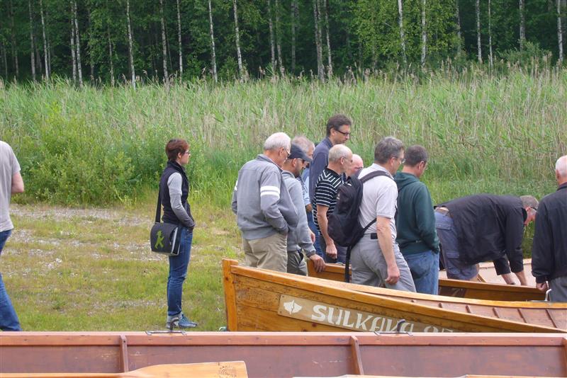 Im Startbereich des 60-km-Rennens in Hakovirta, ein paar Kilometer von Sulkava entfernt, liegen am Ufer schon viele Kirchboote, auch unser Mietboot "Sulkava 7", die später an einem sehr langen, schwimmenden Holzsteg für den Renntag festgemacht werden. Bei einer 10-km-Probefahrt testen wir das Start- und Gleitverhalten. Mit einer hohen Schlagzahl, die im Rennen auf einer so langen Strecke nicht durchzuhalten ist, bringen wir das Boot auf 16,2 km/h. Das ist vielversprechend.