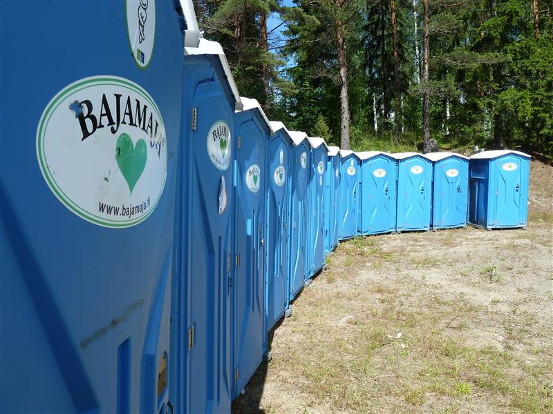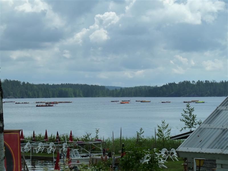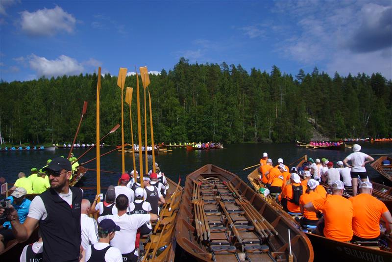 Alle verfügbaren URCD-Mietautos werden zum Zielbereich gebracht, nachdem zuvor die meisten URCD-Ruderer zum Start in Hakovirta geshuttelt worden waren. An dem langen Schwimmsteg liegen beidseitig zig Kirchboote, der Steg taucht an manchen Stellen unter der Last der Ruderer ab, die aufs Einsteigen in die Boote warten, so dass sich hier schon manche nasse Füße holen. Viele Ruderer laufen mit ihrer 5-Liter-Kanister-Schlauch-Konstruktion herum, die teilweise auch gefärbte Flüssigkeiten enthalten, was ein bisschen grotesk aussieht und an Szenen im Krankenhaus erinnert.