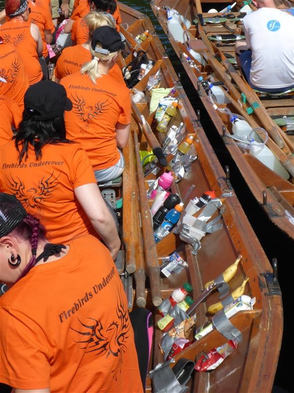 Und essen sollte man laut Juha auch während des Rennens. Er hatte ein kleines Tablettgestell aus Draht gebastelt, das man oben an der Bordwand einhängen konnte. Auf den Tablettebenen waren Tomaten, Gurken und Brotstückchen verteilt, die dann bei Bedarf während des Rennens ihrer Bestimmung zugeführt werden konnten. Er hatte für uns Unerfahrene auch eine Einfachlösung parat: mit Panzerband, in Finnland "Jesus Tape" genannt, einfach Energieriegel auf die Bordwand kleben und im Rennen dort "pflücken". Backbord-Schlagmann Michi Leibinger hatte eine noch einfachere Lösung. Er bestellte beim Steuermann eine geschälte Banane, die dieser ihm abschnittsweise reichen durfte.