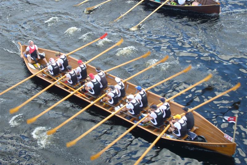 Startschuss. 140 Kirchboote an dieser flussartig verengten Stelle des Sees legen los, das Wasser brodelt. Manchmal trennen die Boote kaum mehr als ein Meter Wasser. Und wir mittendrin – ein tolles Gefühl. Zuerst Schlagzahl 30, um aus diesem Getümmel etwas herauszukommen. Detlef steuert uns an den Rand des Feldes, um freie Bahn zu haben. Viele Kirchboote rudern nur mit einem Kernschlag d.h. die Ruderer nutzen gar nicht die gesamte Rollbahn, dafür ist die Schlagzahl höher - vielleicht ein Überbleibsel aus der Zeit, als die Kirchbootfahrer statt auf einem Rollsitz auf einem Balken saßen. Auch Juha hatte vermutlich diesen Stil zuvor benutzt, deshalb rumpelte es ab und zu, wenn sein Blatt mit dem Blatt des Vordermannes leicht zusammenstieß.