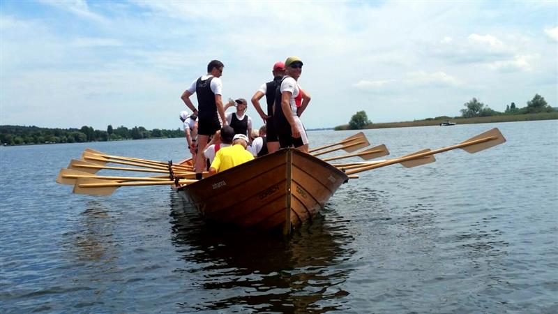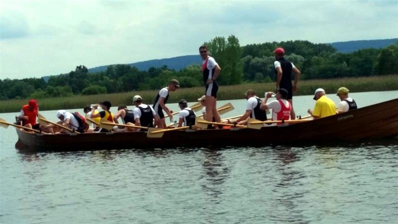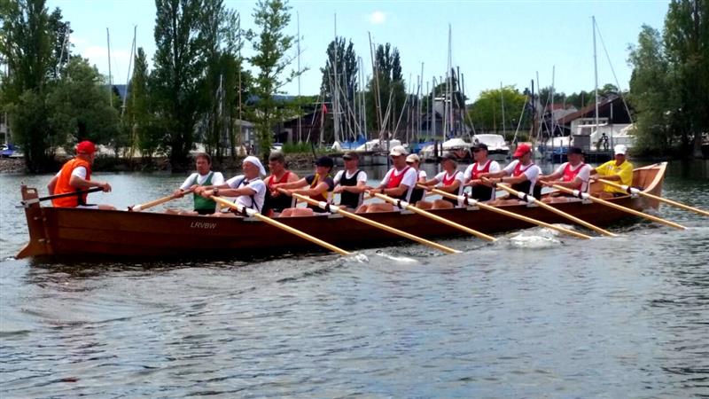 Der Landesruderverband Baden-Württemberg hat seit kurzem ein Superluxus-Kirchboot, allerdings nicht aus Finnland, sondern aus Speyer, Taufpatin: Johanna Kienzerle, der Standort: Radolfzell am Bodensee. Die Trainigsroute als Vorgeschmack auf 60 km: Radolfzell – Reichenau – Konstanzer Seerheinbrücke und zurück, zusammen 37 km. Am 13.6.2015 stechen wir mit Jungsteuermann Klaus Karok in See. Wo man am Bodensee sonst eher in Ufernähe rudert, sucht Klaus den direkten Weg. Die Wellenberge – und –täler dort steckt Johanna gut weg. Bei Wind und Wellen gestaltet sich die Fahrt relativ zäh, die besonders strapazierten Körperteile, vor allem Hinterteil und Hände melden sich auch auf dieser Kurzstrecke.