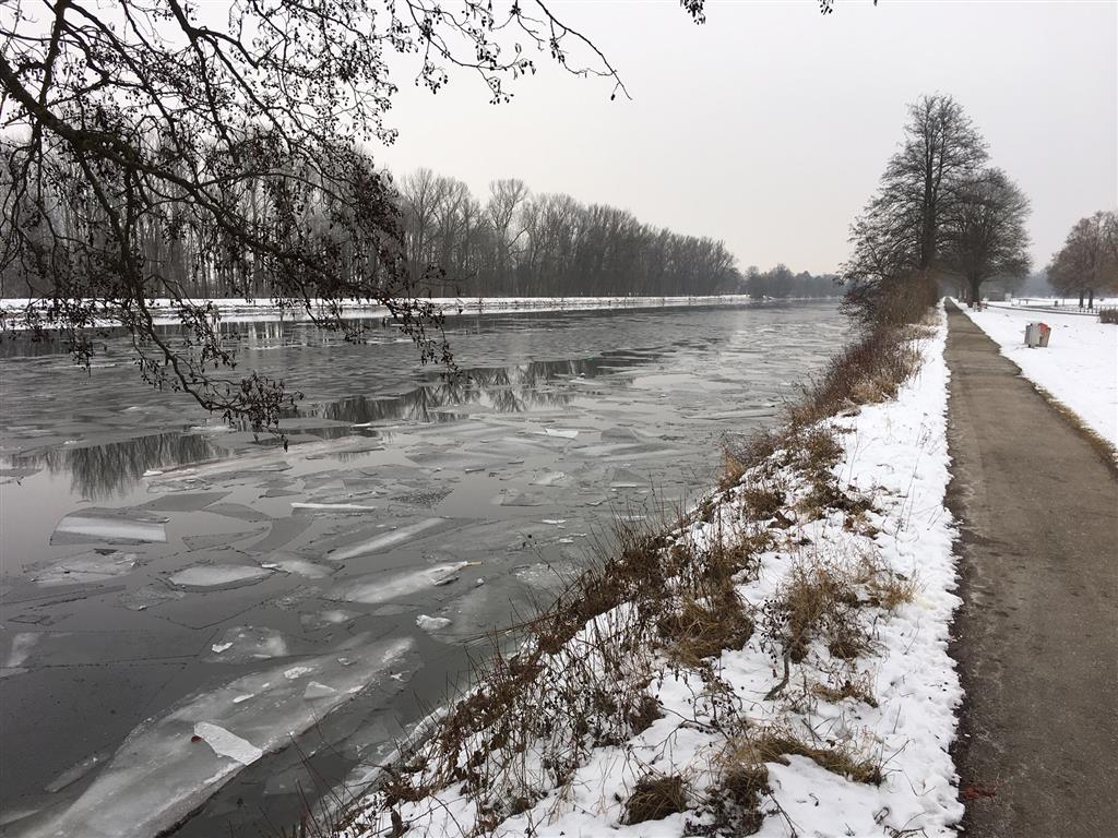 Oben Richtung Fihei hat's zu wenig Wasser, unten nach dem Fußgängersteg Offenhausen ist die Donau wegen Eisschollen unpassierbar. Da bleibt fast nur noch der Gang in den Kraftraum.