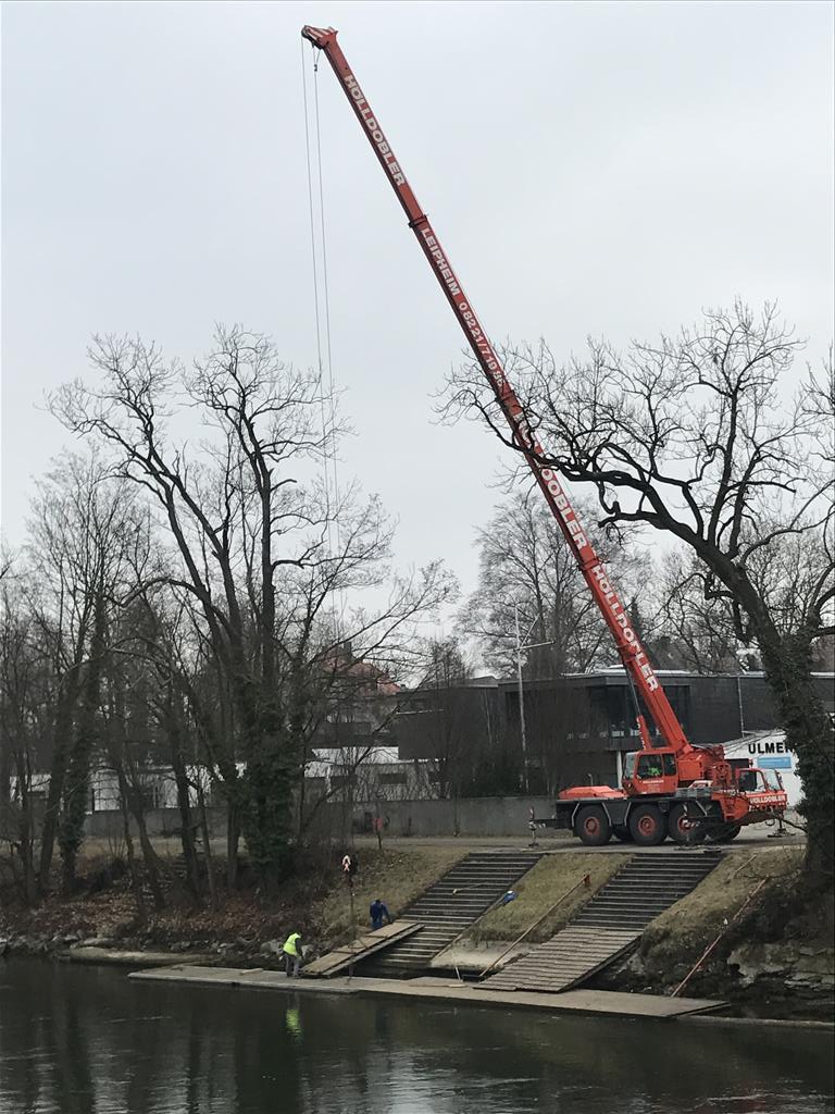 Geschrieben von Ulmer Ruderclub Donau e.V.. Die Erneuerung der Steganlage hat begonnen Der Kran muss hoch hinaus, um die Flöße aus dem Wasser heben zu können. Fotogalerie von Gerhard Strähle (4), Markus Reinholz (4) und Michael Leibinger (1) Geändert am 06. Juni 2020. Aufrufe: 2063